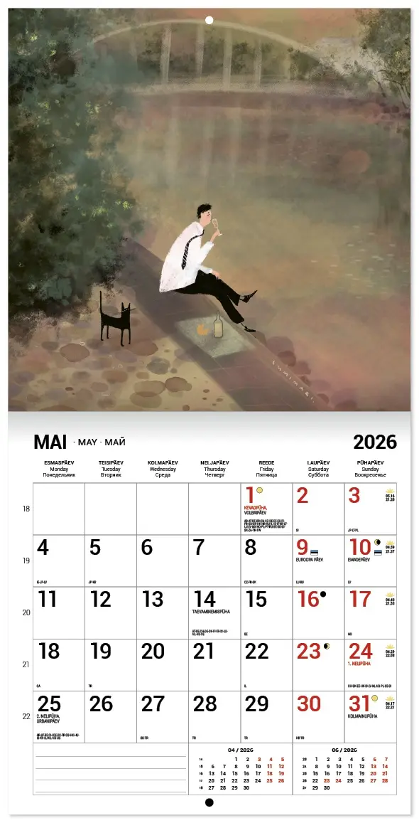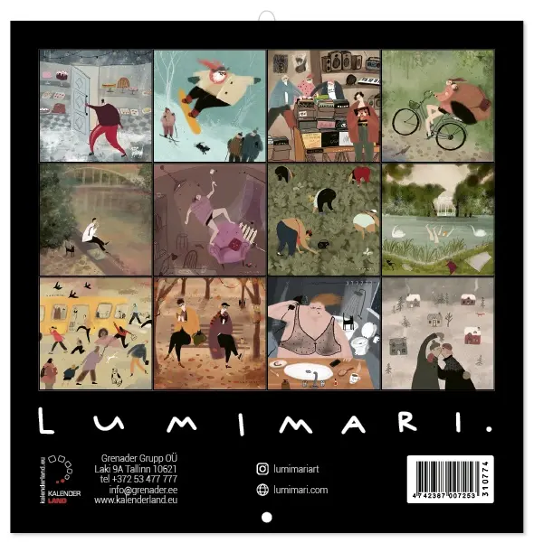 HEA TUJU kunstikalender 2026, ruut, klamberköide – Ruudukujuline seinakalender, 225x225mm, klamberköide, 12 Lumimari pilti. Kalendaarium sisaldab lipu- ja tähtpäevi, päikesetõuse ja -loojanguid, kuufaase ja nimepäevi.