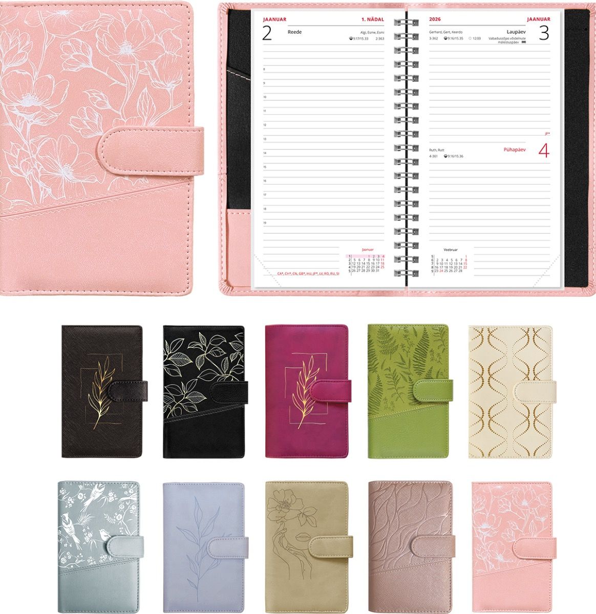 Kunstnahast kaante ja päevajaotusega spiraalköites kalender, lk mõõt 93×170 mm. Trukiga kinnitus. Kalendaarium sisaldab riigipühi, riiklikke ja rahvakalendri tähtpäevi, lipupäevi, nimepäevi, 42 riigi pühi lühenditena, päikese tõusu ja loojangu aegu, kuu faase, aastaaegade alguseid, käesoleva ja järgneva aasta plaane, aasta tabelkalendreid, foneetilisi tähestikke. Pliiatsihoidja.